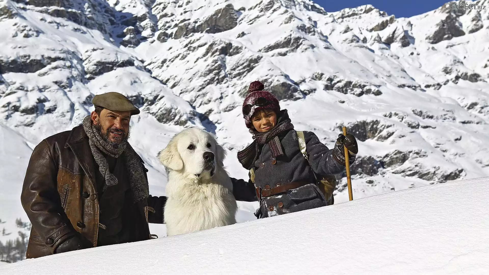 Mężczyzna, Pirenejski pies górski, Film, Alpy, Zima Dziecko, Bella i Sebastian, Góry - faceci.biz